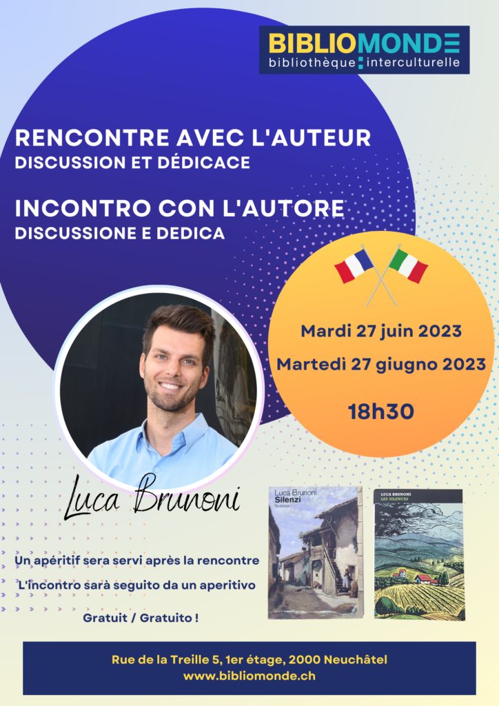 Rencontre avec l’auteur – Luca Brunoni ! Rejoignez-nous pour une discussion (en français et en italien) avec Luca sur ses trois livres, écrits en italien et un traduit en français. « Les Silences » est disponible à l’achat directement chez Bibliomonde avec dédicace le soir (CHF 30, en espèces seulement).