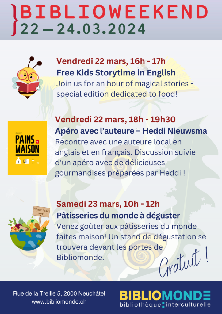 Rejoignez-nous pour une discussion (en anglais et en français) avec l’auteure locale Heddi Nieuwsma sur ses livres de cuisine dans le cadre du Biblioweekend. Heddi présentera ses deux livres, « Pains Maison » et « Douceurs Suisses », et proposera de délicieuses gourmandises préparées à partir de ses recettes. Il existe également la possibilité d’acheter les livres (anglais, français ou allemand), directement à Bibliomonde avec dédicace le soir (30 CHF pièce, en espèces uniquement). Un apéritif sera servi après la discussion.